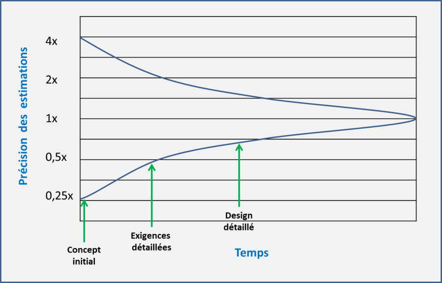 Il incarne l’idée que les estimations faites au début d’un projet seront limitées dans leur exactitude et quand vous travaillez à réduire l’incertitude dans le projet, les estimations peuvent devenir plus précises au fil du projet. Au cours du projet, le concept, les exigences et la conception vont s’étoffer pour donner une bien meilleure idée de la faisabilité, des délais et des coûts du projet.