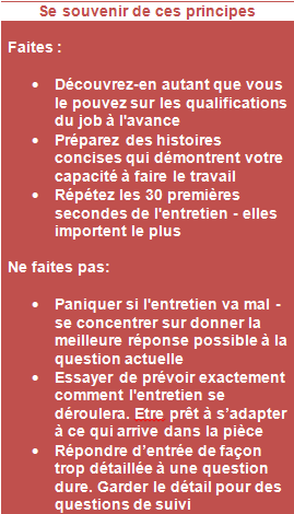 Avant que vous n’entriez la pièce, décidez quels trois ou quatre messages vous voulez transmettre à l’intervieweur. Ceux-ci devraient « établir la connexion entre ce que vous avez déjà réalisé et ce qui est vraiment nécessaire pour réussir dans le travail et le contexte spécifique » dit Fernández-Aráoz. John Lees dit que la meilleure façon de faire ceci est de prévoir ses histoires à l’avance. « Les gens achètent beaucoup plus sur des histoires qu’ils ne le font sur les preuves ou les données » dit-il. Vos histoires devraient être concises et intéressantes. Assurez-vous qu’elles ont une bonne entame, comme, « je vais vous parler d’une fois où j’ai sauvé l’organisation ». Puis, apprenez-les sur le bout des doigts. Sachez comment elles commencent et finissent, ainsi vous pouvez les retransmettre sans trébucher ni ressembler à un robot. Chaque fois que possible, utilisez une de vos histoires pour répondre à une question d’entretien.