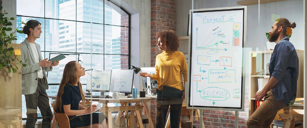 Que fera l’équipe si certaines personnes travaillent ensemble, debout devant un tableau blanc ?