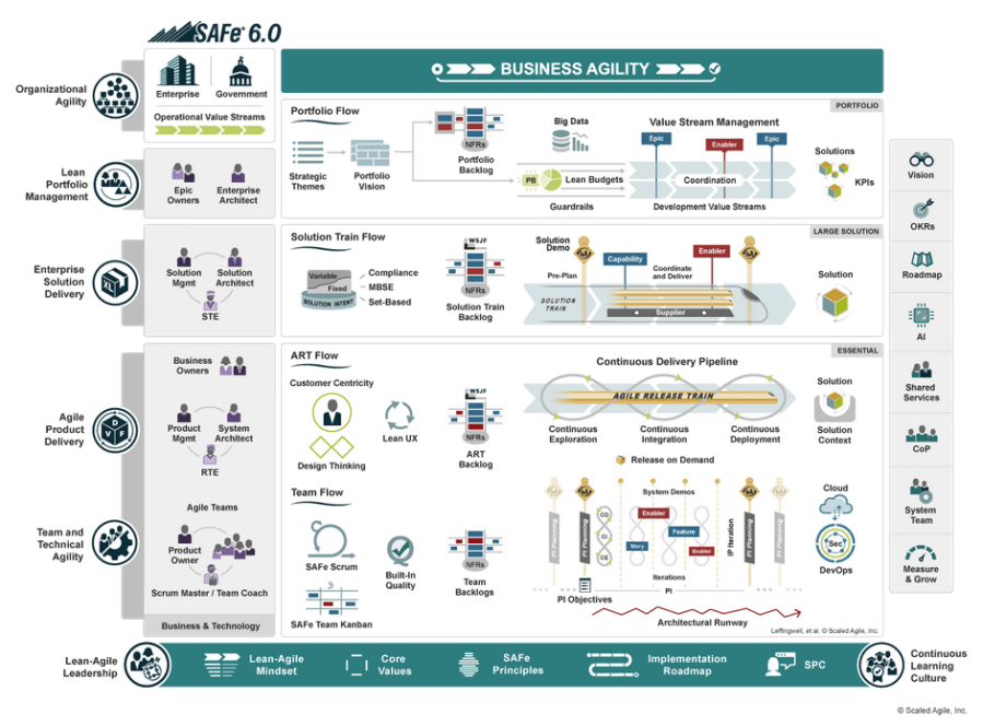 Cette version représente une avancée significative dans la façon dont les entreprises intègrent les pratiques SAFe dans le travail quotidien, font perdurer le changement et obtiennent les avantages d’une véritable agilité business. SAFe 6.0 comprend de nombreuses nouvelles pratiques pour supporter les dernières tendances technologiques et business, y compris comment accélérer le flux de valeur et étendre SAFe à travers toute l’organisation à d’autres fonctions business.